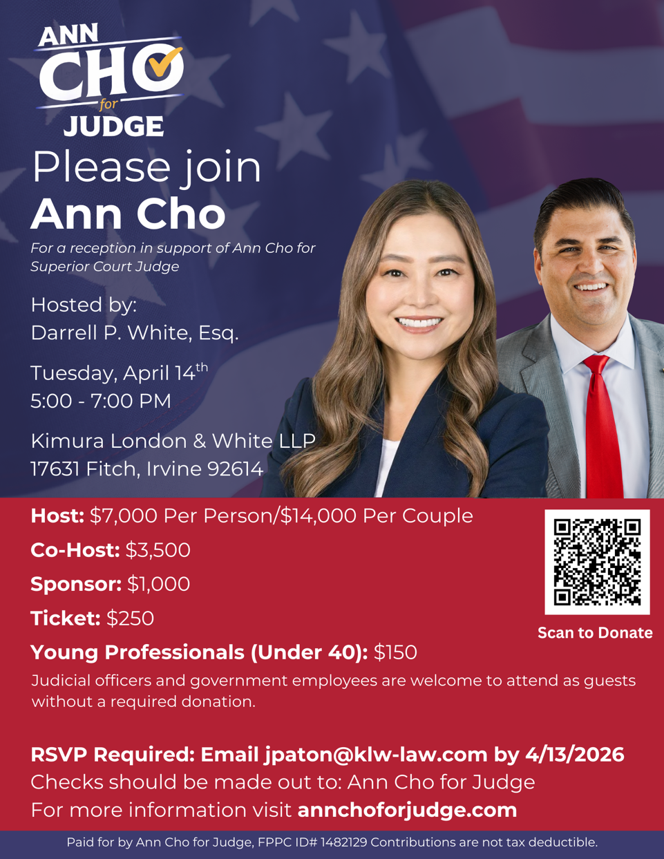 Make plans to join me for the Ann Cho for Orange County Superior Court Judge New Year Fundraising Reception at Call & Jensen at 610 Newport Center Dr., Suite 700, Newport Beach, CA 92660.